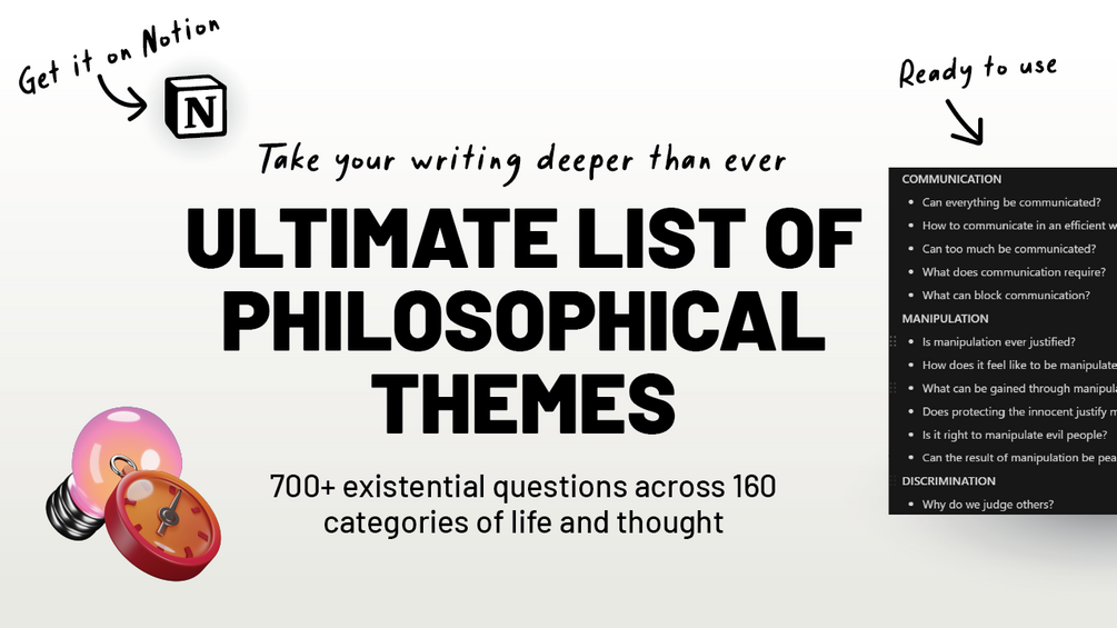 The Ultimate List of Philosophical Themes includes a massive 700+ questions across 160 categories, organized into 5 domains. These questions can help you explore and deepen your understanding of the themes you choose to include in your writing.